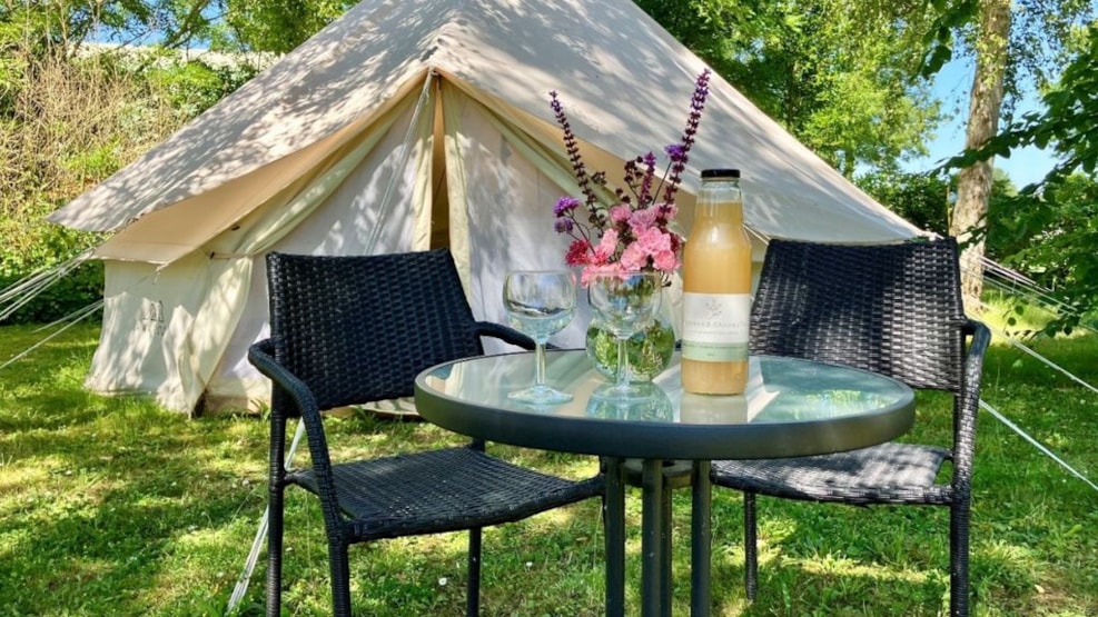 Fra 1 maj til 15 september er det muligt at booke overnatning i vores glamping telt. Teltet er udstyret med en dobbeltseng, med mulighed for at lave to enkeltsenge. I teltet er det muligt at side ind ved dårligt vejr, samt havemøbler udendørs. Bad og toilet befinder sig ca. 100 meter fra teltet.