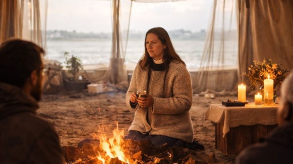 Midt i teltet brænder bålet, hvor alteret normalt står. Flammerne, varmen og lyset danner rammen om en anderledes gudstjeneste – enkel, åben og i øjenhøjde. Her mødes ord, stilhed og fællesskab i et rum, hvor naturen er med som medfortæller.