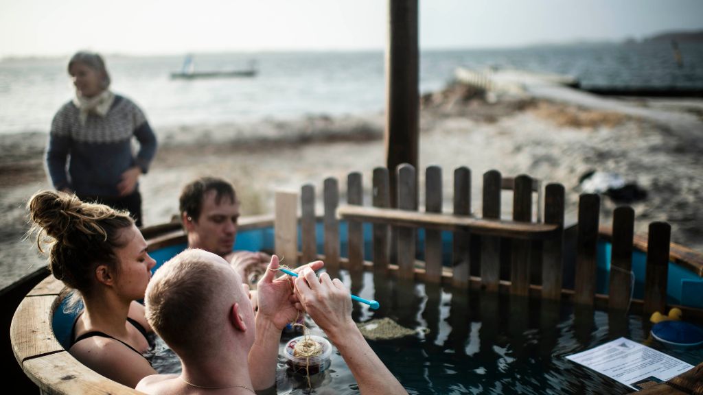 Vi glæder os til en anderledes oplevelse med strik og hækling i det varme vand tæt på stranden ved Klinten.